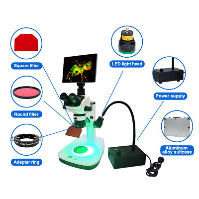 Флуоресцентный адаптер для стереомикроскопа DK-300X - это комплексное решение для добавления флуоресценции к существующим стереомикроскопам. Он включает в себя все необходимое для адаптации (а не преобразования) практически любого стереомикроскопа. Он также может быть использован в качестве источника возбуждающего света отдельно, вы можете выбрать несколько длин волн и наблюдать за экспрессией различных флуоресцентных белков.