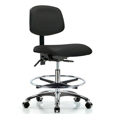 Виниловый стул Chrome - Скамья средней высоты с наклоном сиденья, хромированным кольцом для ног и колесиками черного цвета.