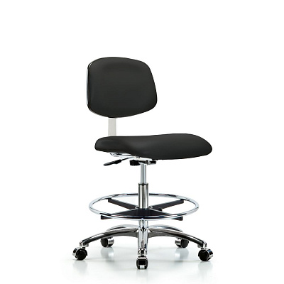 • Виниловый стул для чистых помещений класса 10, хромированный - Средняя высота скамьи с хромированным кольцом для ног и роликами черного цвета